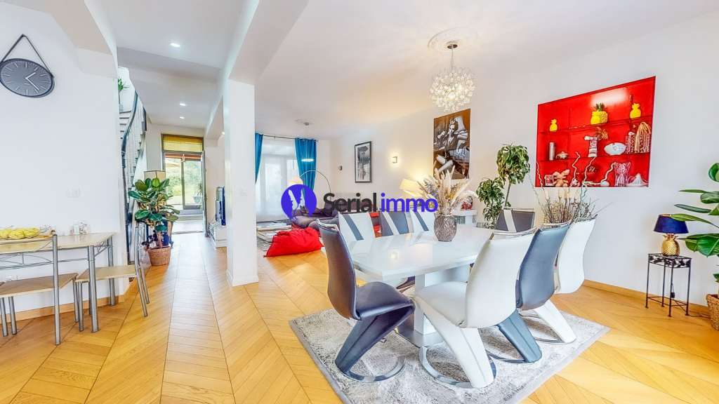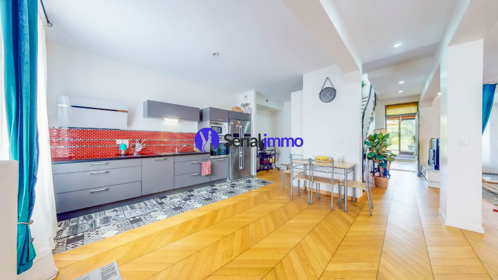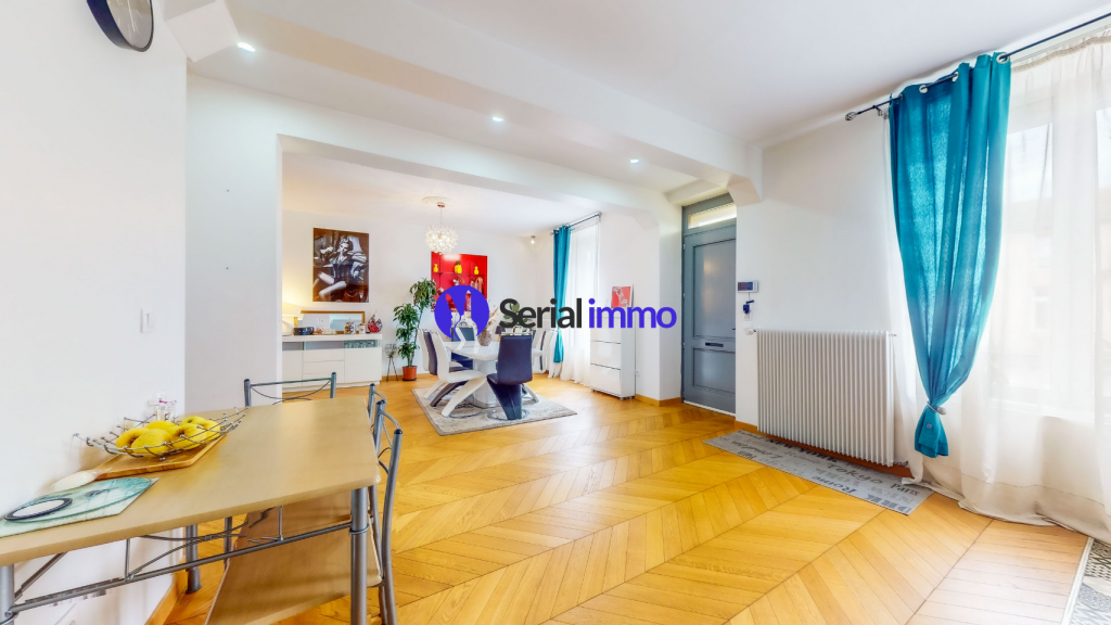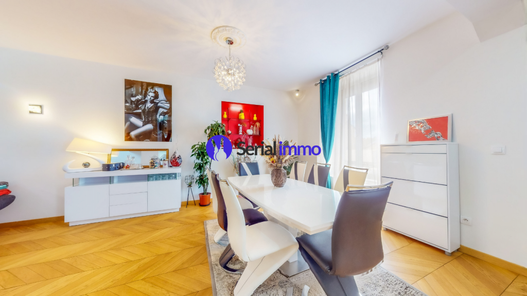 • Pièce de vie traversante, avec parquet chêne massif en point de Hongrie, volumineuse et baignée de lumière naturelle